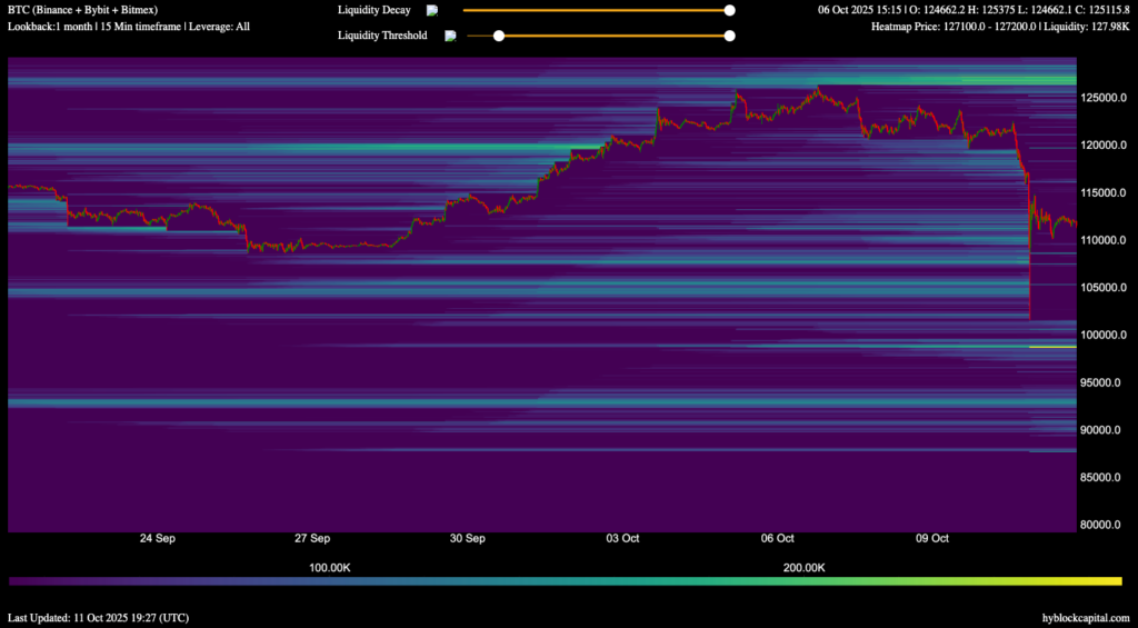 «اگر به دادههای هیت مپ لیکوییدیشن از Hyblock Capital نگاه کنیم، که اساساً موقعیتهای معاملاتی خرید (long) و فروش (short) را در دفتر سفارشات صرافیهای متمرکز مختلف نشان میدهد، میبینیم که یک ناحیه نقدینگی از موقعیتهای خرید وجود داشت که مورد هدف قرار گرفت… این ناحیه از ۱۲۰،۰۰۰ دلار تا ۱۱۵،۰۰۰ دلار و از ۱۱۵،۰۰۰ دلار تا ۱۱۳،۰۰۰ دلار امتداد داشت.»